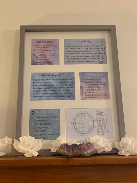 Based on your date, time and location of incarnation, we will create you a personalised ‘astro frame’ packed full of insights into your how your Soul has chosen to manifest in this life. Includes your birth chart.